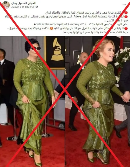ويبدو أن بعض المستخدمين، تعمدوا استخدام الصورتين في سياق مضلل على أن أديل ارتدت نفس فستان “كوكب الشرق” أم كلثوم.