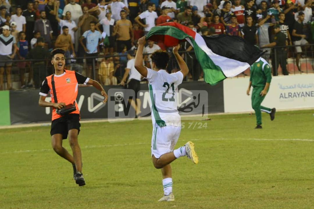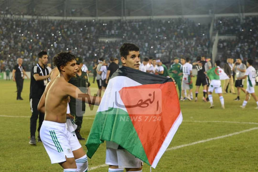 حيث سارع أشبال الناخب الوطني، أرزقي رمان، لرفع الأعلام الفلسطينية خلال مراسيم الاحتفال بملعب “سيق”.