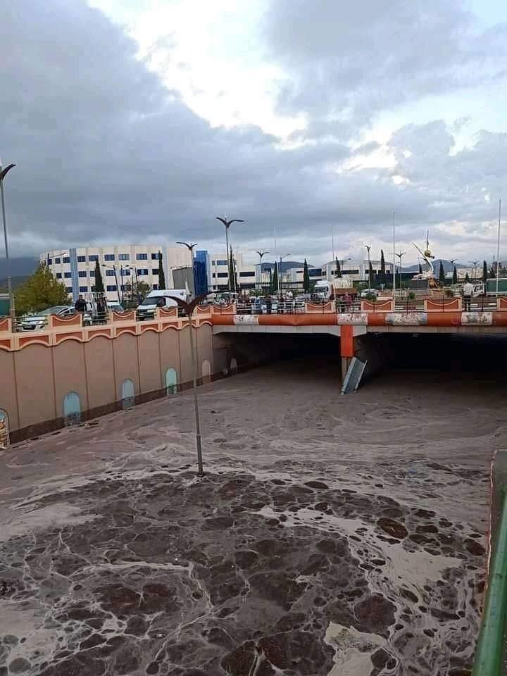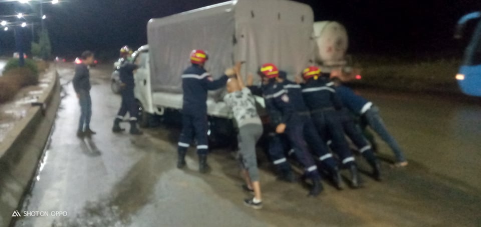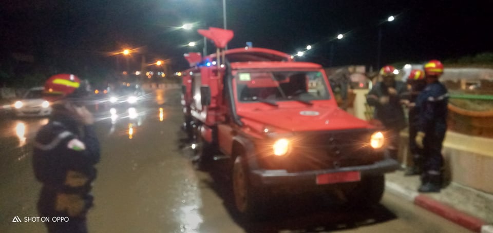 وتدخلعناصر الرتل المتنقل لمكافحة حرائق الغابات الموجود ببلدية فيسديس لتقديم يد المساعدة للمارة مع ابعاد المركبات العالقة وسط الاوحال والسيول تحت الجسر المقابل لجامعة فيسديس، والعملية متواصلة.