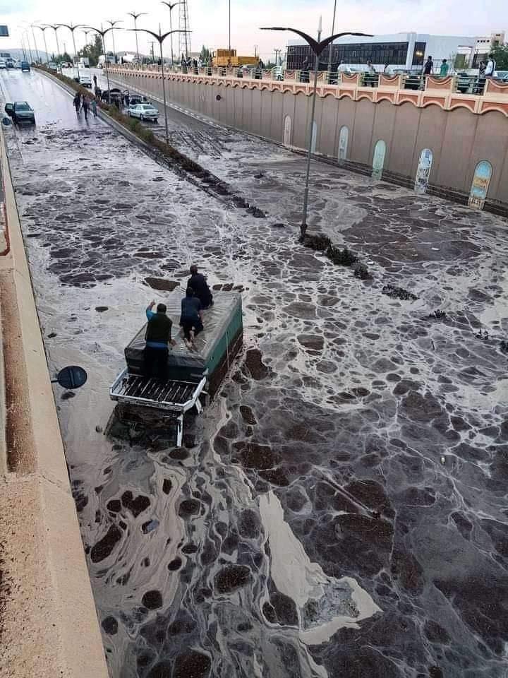 كما سجلت تساقطات غزيرة بالطريق الولائي رقم 26 الرابط بين فسديس والمعذر، وبعض احياء مدينة المعذر.