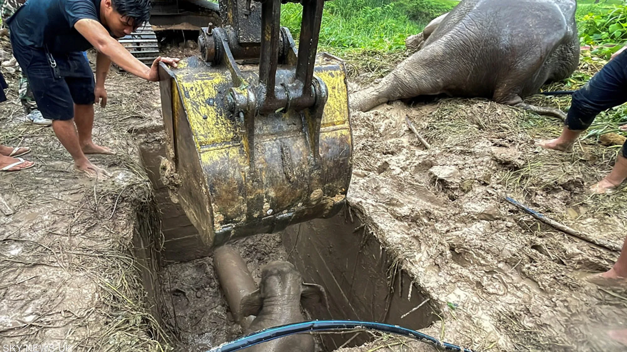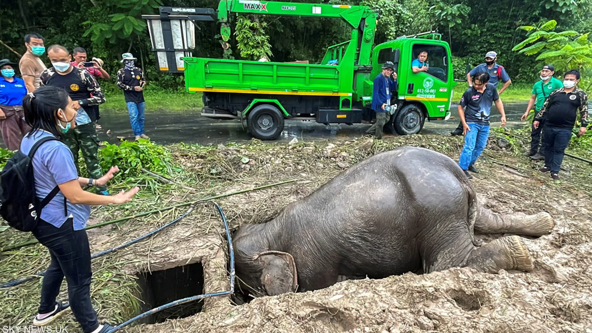واستخدم رجال الإنقاذ رافعة محمولة على شاحنة لسحب الأم للخارج، كما أجري لها إنعاش في الموقع. وبعد مرور ثلاث ساعات، تمكن فريق الإنقاذ من إخراج الفيل الصغير من الحفرة.