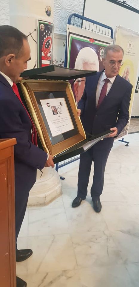 وفي الختام تم تكريم الشهيد القائد الرمز ياسر عرفات وقدم رئيس حزب فضل لسعادة السفير أمين مقبول لوحة فنية للرئيس القائد الراحل ياسر عرفات، وبدوره قدم السفير للطيب ينون رئيس حزب “فضل” لوحة فنية للشهيد الفريق احمد قايد صالح رئيس الأركان السابق تكريما لروح الفقيد.
