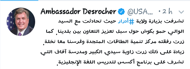 هذا وحط السفير الأمريكي الرحال اليوم الجمعة، بولاية أدرار، حيث، عبر بتغريدة في حسابه الشخصي على “تويتر”: “تشرفت بزيارة ولاية أدرار حيث تحادثت مع  الوالي حمو بكوش حول سبل تعزيز التعاون بين بلدينا”.