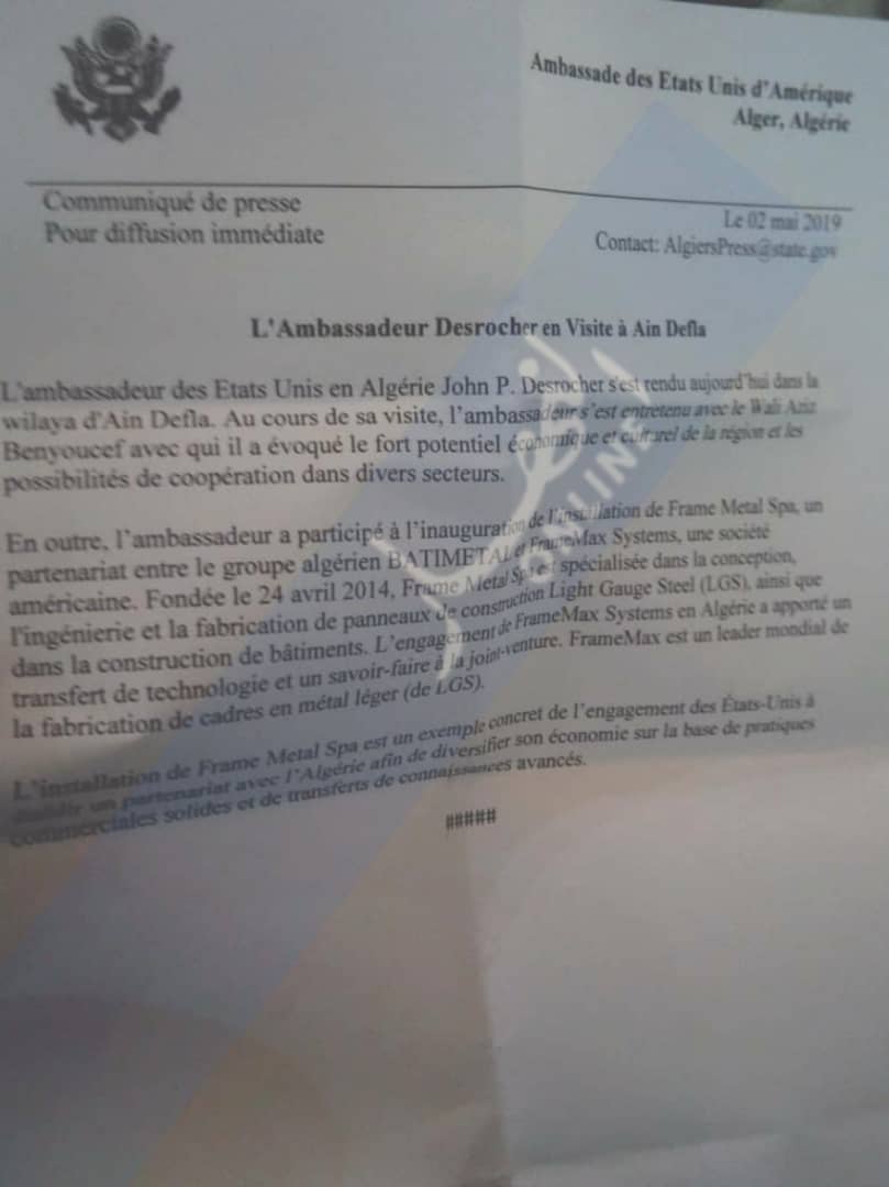 بالصور: السفير الأمريكي في عين الدفلى للوقوف على مشروع “فرام ميتال”