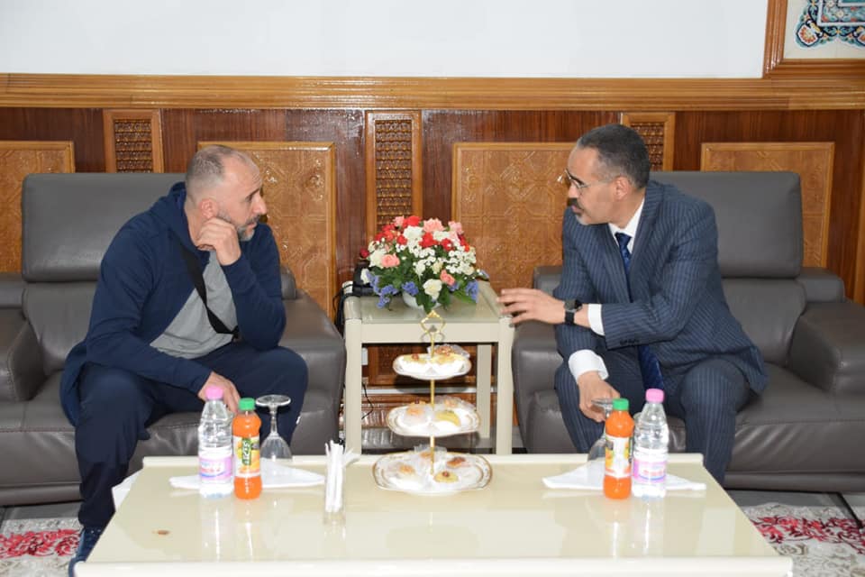 وكان في إستقبال الناخب الوطني، جمال بلماضي، وزير الشباب والرياضة عبدالرزاق سبقاق، وتبادلا معا أطراف الحديث.