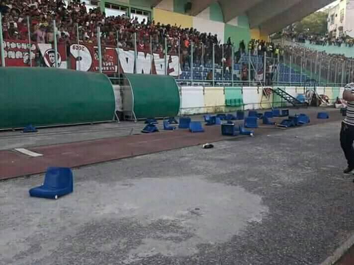 وعمد الأنصار إلى تحطيم كراسي المدرجات الخاصة بهم ورميها داخل أرضية الميدان، وهذا إحتجاجا على الحكم.