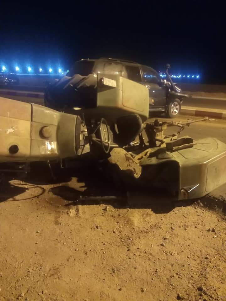 عرف الطريق الوطني رقم واحد بعين صالح، ولاية تمنراست، حادث مرور بين سيارة رباعية الدفع وجرار فلاحي.