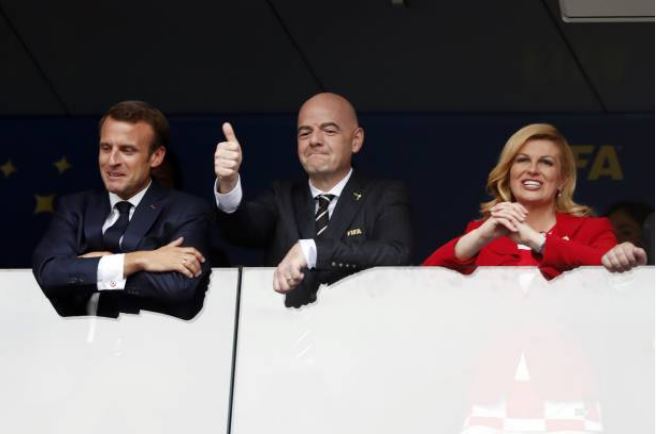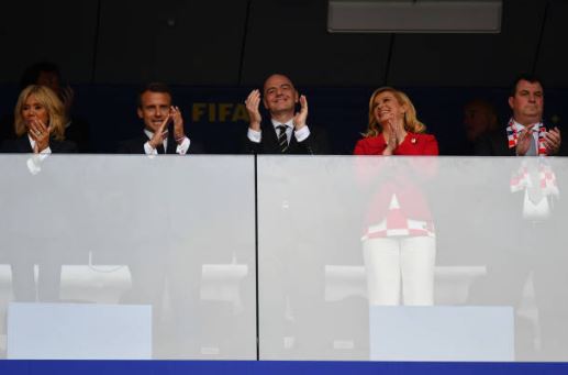 تابعت رئيسة كرواتيا كوليندا كيتاروفيتش، نهائي المونديال رفقة الرئيس الفرنسي إمانوال ماكرون وزوجته، وتوسطهم رئيس “الفيفا” أفانتينو.
