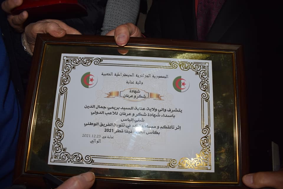 كما تم تقديم شهادة تقدير للاعب الخضر، بالإضافة لهدايا رمزية، اعترافا وفخرا بالانجاز الذي حققه شتي، رفقة المنتخب الوطني.