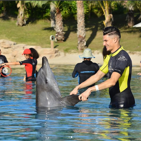وظهر لاعب إتحاد العاصمة السابق في الصورتين وهو يُداعب “الدلفين” داخل حوض السباحة مُستغلا فترة توقف بطولة الدرجة الثانية الفرنسية.