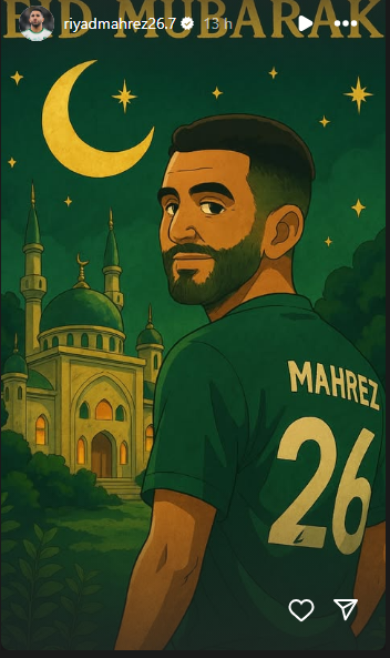 كما نشر قائد الخضر ولاعب الأهلي السعودي رياض محرز، صورة له،عبر “ستوري” خاص له عبر منصة “انستغرام” ليبادل التهاني مع الجميع. على طريقة ستوديو “GHIBLI”.