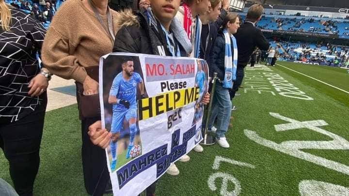 كما حملت اللافتة عبارة:”محمد صلاح من فضلك ساعدني للحصول على قميص رياض محرز و كيفين دي بروين”.