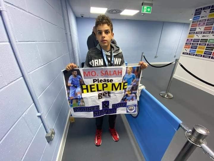 الطفل المشجع رفع لافتة مُطالبا بها، محمد صلاح، لمساعدته للحصول على قميص، رياض محرز، وكيفين دي بروين.