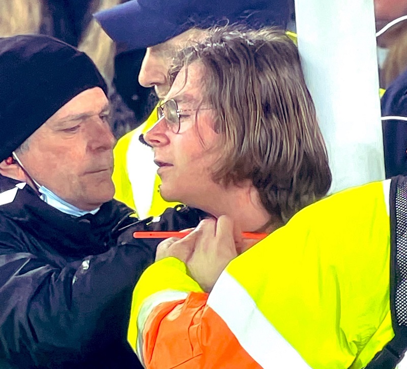 وأوقف الحكم المباراة لتحرير المشجع، الذي ارتدى قميصا يحمل عبارة “Just stop oil”.