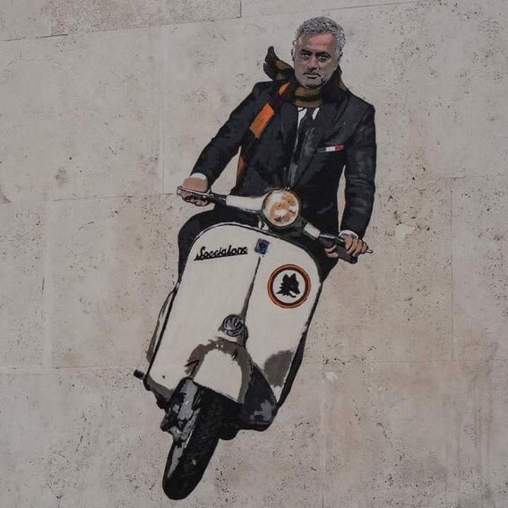 وأقدم مورينيو، على هذه الخرجة، بعد اللوحة الفنية التي رسمها له فنان ايطالي على أحد جدران شوارع روما، والتي تظهره فيها على دراجة نارية.