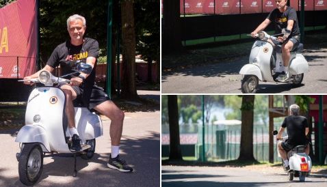 وفاجأ مورينيو، سكان ومرتادي شوارع العاصمة الإيطالية، من خلال تنقله إلى مقر تدرب فريقه الجديد روما، على دراجة نارية “فيسبا”.