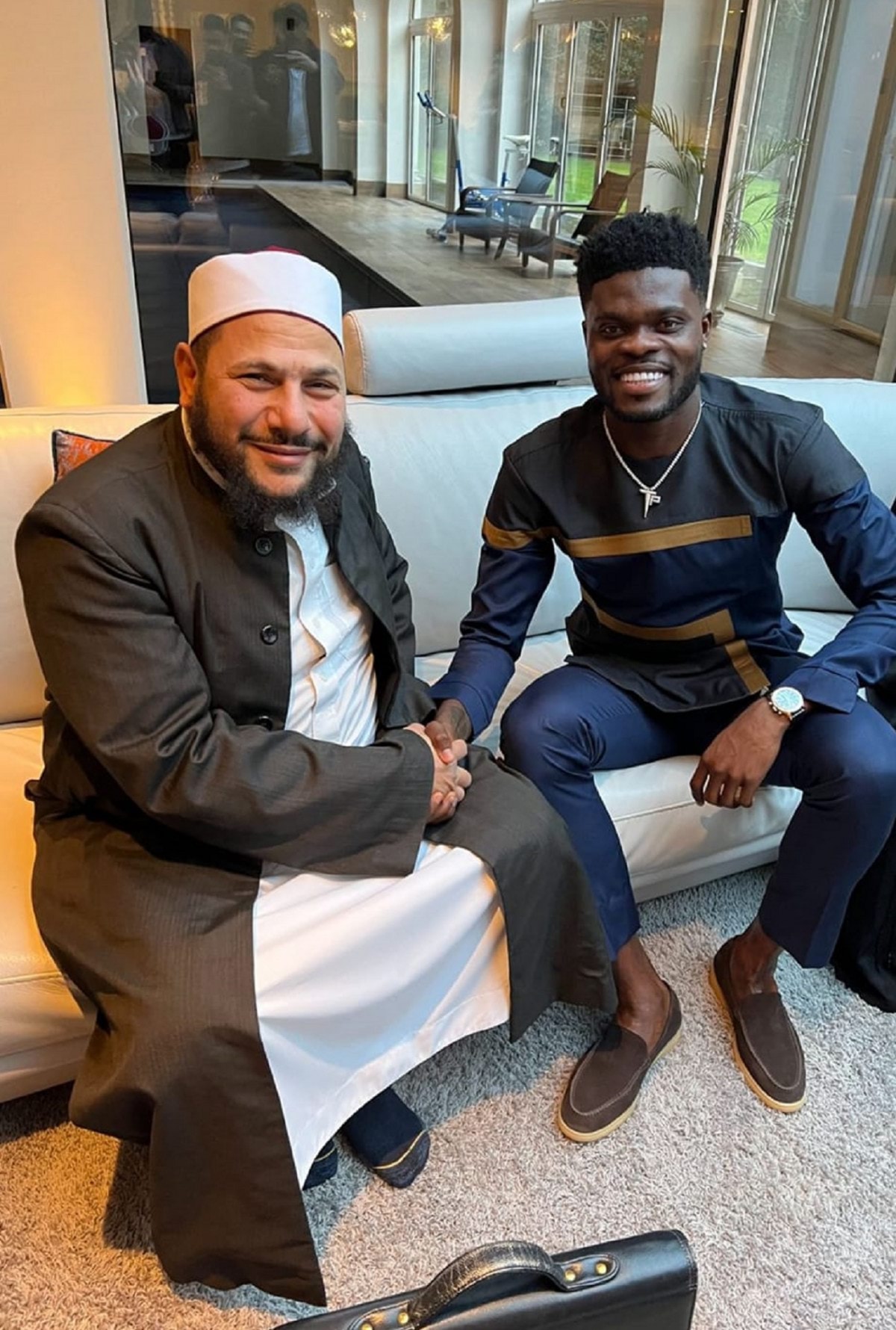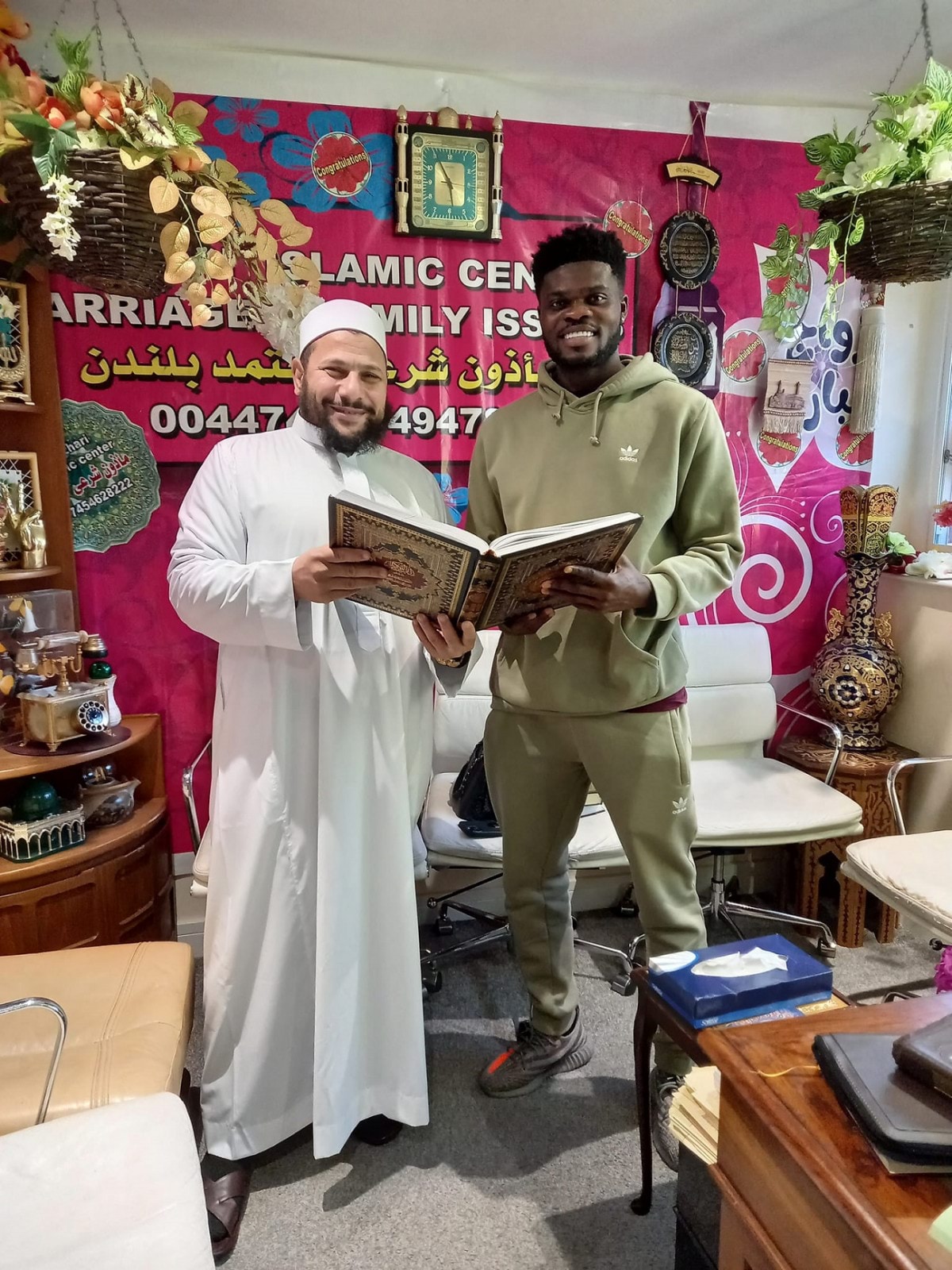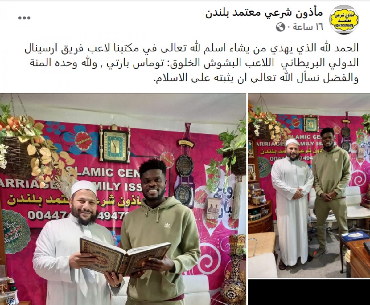 نشر حساب عبر الفايسبوك، بإسم ”مأذون شرعي معتمد بلندن“ صورا لإمام مع لاعب أرسنال توماس بارتي، يحملان مصحف للقرآن الكريم.