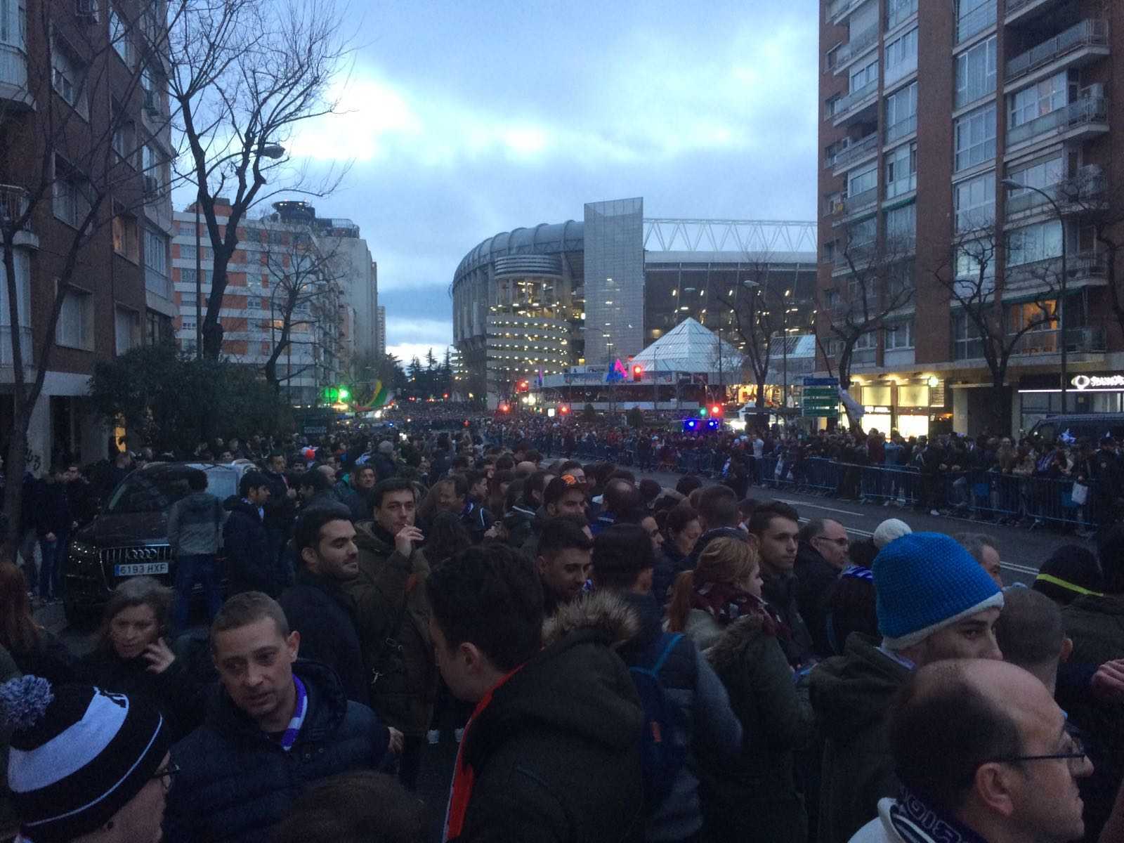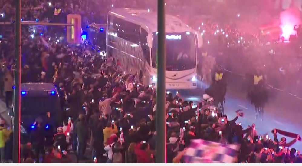 وتجمع ألاف المُناصرين أمام المدخل المُخصص لحافلة الملكي بملعب سانتياغو بيرنابيو بالعاصمة مدريد مُرددين الشعارات المُناصرة للميرينغي.