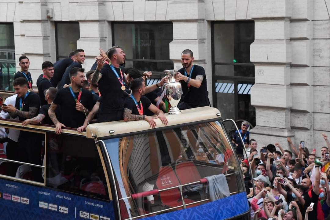 زملاء القائد “جيورجيو كيليني” جابوا  شوارع العاصمة الإيطالية “روما” بالكأس الغالية على متن حافلة مكشوفة وسط حضور جماهيري كبير.