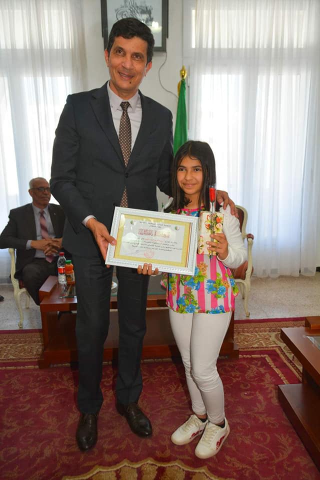 كما تم تكريم التلميذة بلكحل منى رباب، تقديرا لها لحصولها على المرتبة الأولى في مسابقة الإبداع في القلم الحر المنظمة بجامعة الفيوم بجمهورية مصر العربية