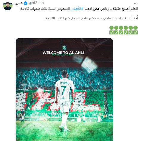 تفاعل جمهور الأهلي السعودي بشكل رهيب بعد إعلان قناة “بيان سبورتس” القطرية عن حسم صفقة انتقال الدولي الجزائري رياض محرز.