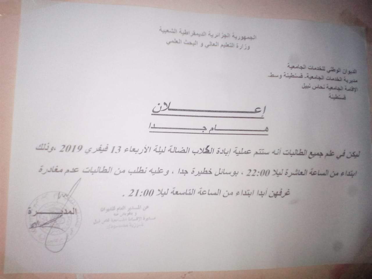 تعيش الإقامة الجامعية للبنات نبيل نحاس بولاية قسنطينة، على وقع فضائح بالجملة، لما تشهده من نقص فادح في المرافق الضرورية للإقامة.