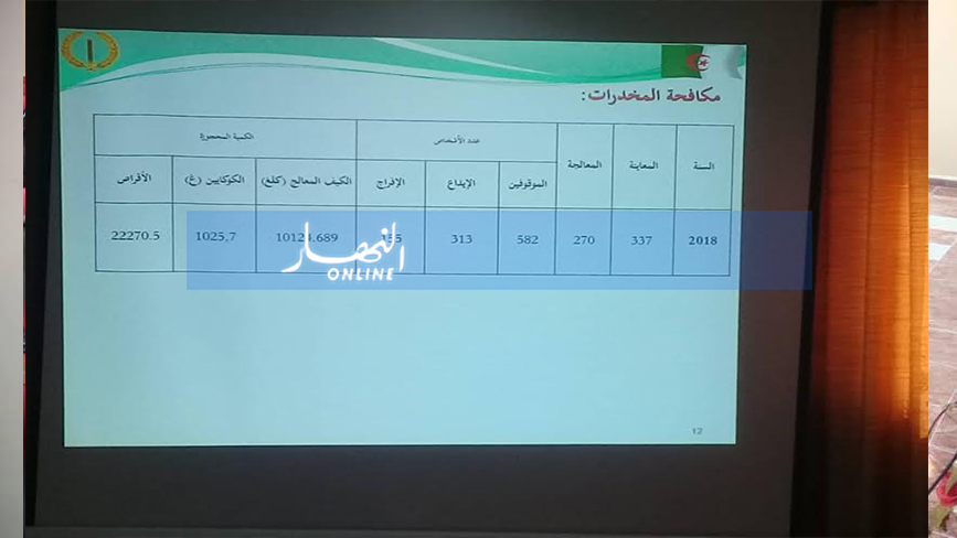 أي أزيد من 10 طن و 1025.7 غ من الكوكايين إضافة الى 22270.5 قرص مهلوس تم توقيف على إثرها 528 شخص ومعالجة 270 قضية متعلقة بالمخدرات.