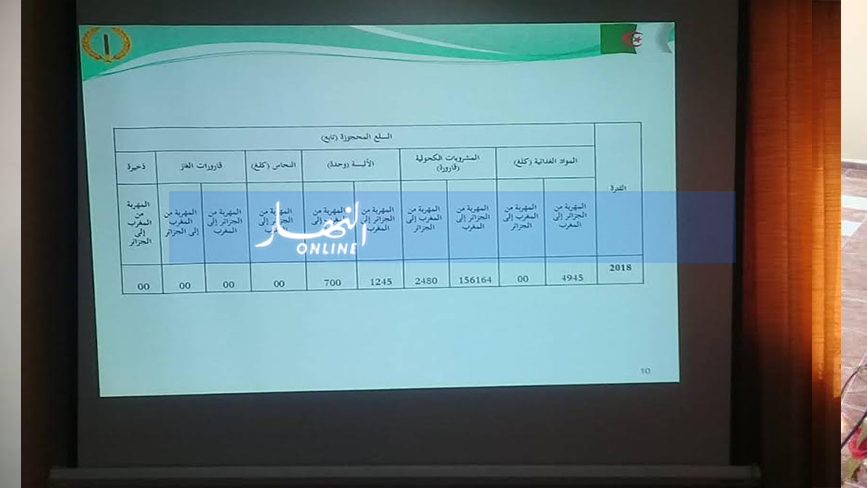 كما تم حجز 4945 كلغ من المواد الغذائية المهربة من الجزائر إلى المغرب إضافة الى 156164 وحدة من المشروبات الكحولية كانت مهربة من الجزائر الى المغرب.