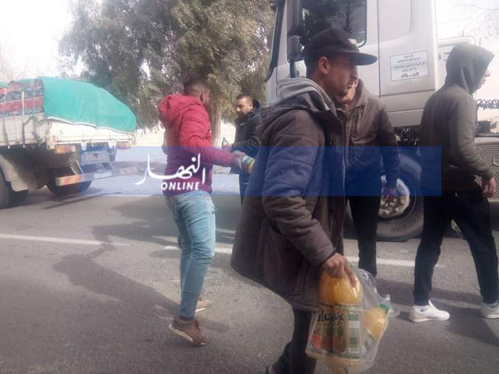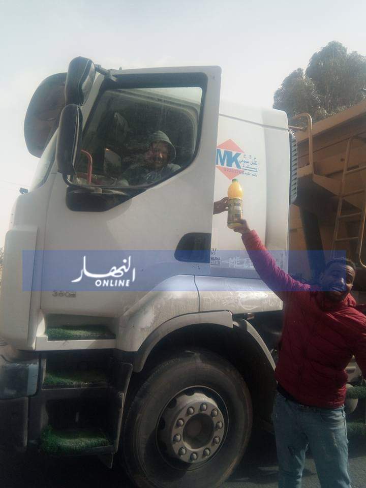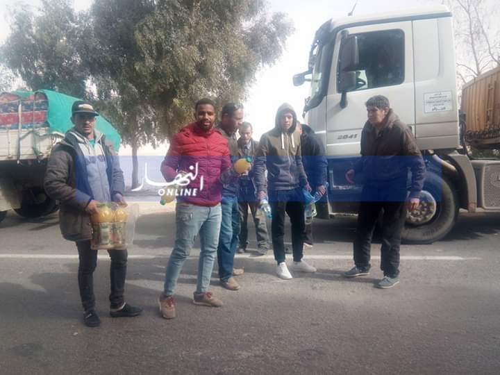 ومنع المحتجون المارة من العبور الا المرضى اووالعائلات كما تم تقديم وجبات ساخنة لسائقين الشاحنات بعد تعطيل طريقهم .