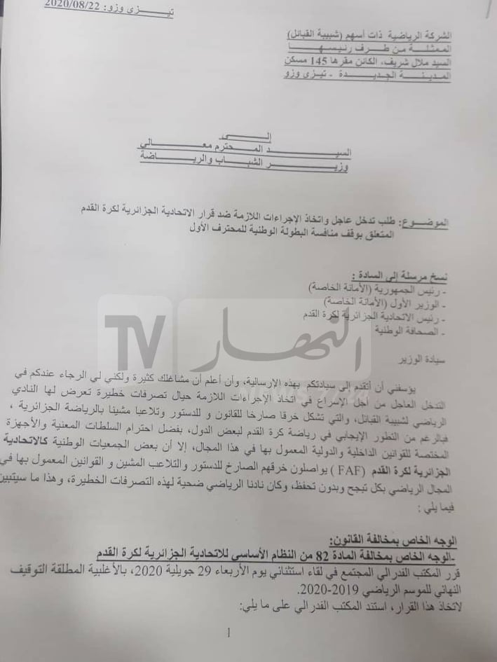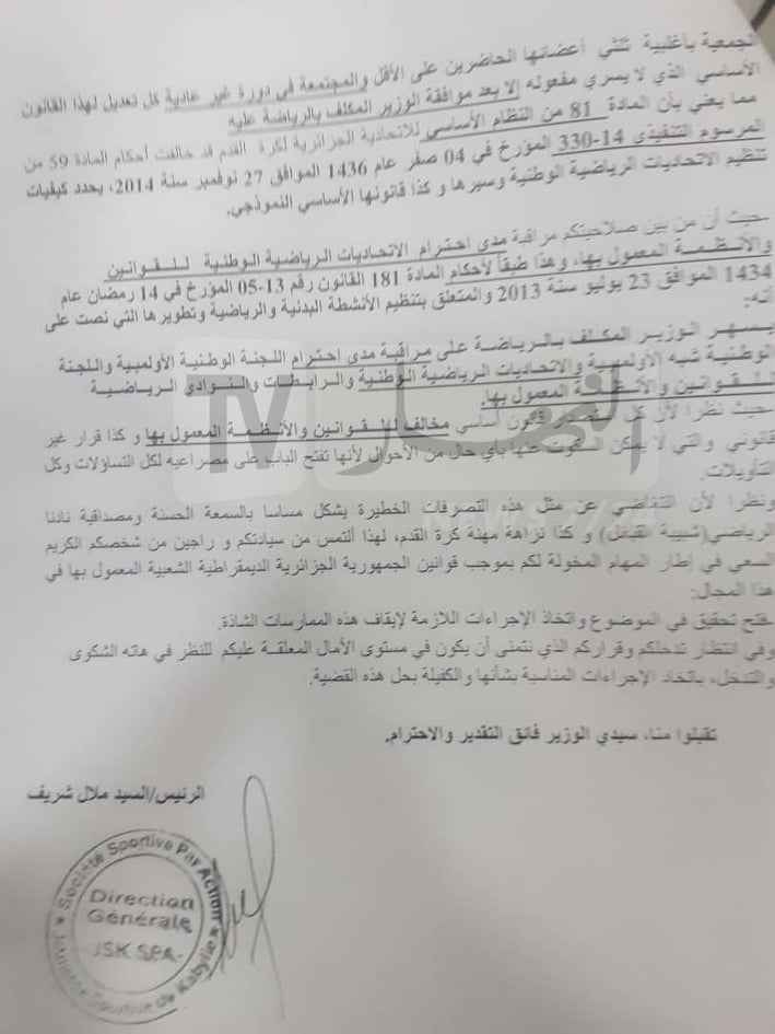 وأعلنت إدارة النادي القبائلي، في بيان لها، أنها وجهة رسالة لكل من رئيس الجمهورية عبد المجيد تبون، الوزير الأول، وزير الشباب والرياضة، ورئيس الفاف.