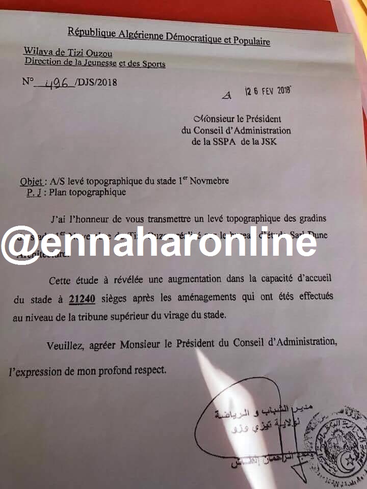 وأرسلت مديرية الشباب والرياضة لولاية تيزي وزو، هذه الوثيقة، لإدارة شبيبة القبائل، لتأكيد أحقيتها في لعب ربع نهائي الكأس بملعبها.