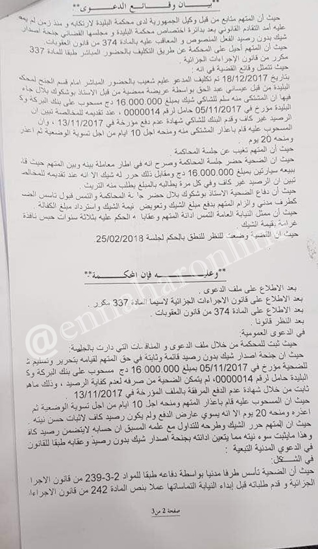 قبل أن يمهله الضحية حسب وثائق المحكمة لأكثر من 30 يوم من أجل إسترجاع أمواله لكن هذا الأخير أخلف ما جعله يرفع دعوة ضده.