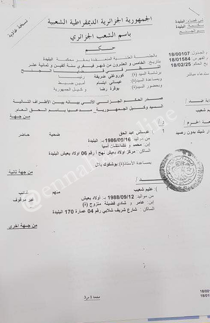أدان ممثل النيابة العامة لمجلس قضاء البليدة بالسجن 3 سنوات نافذة في حق رئيس إتحاد البليدة شعيب عليم، بتهمة تحرير شيك بدون رصيد.
