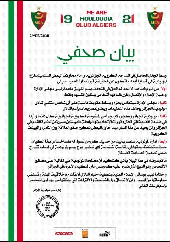 إدارة العميد أصدرت بيانا صحفيا أكدت فيه أنه لايحق لأي شخص الحديث بإسم المولودية ماعدا رئيس مجلس الإدارة وخلية الإعلام والإتصال.