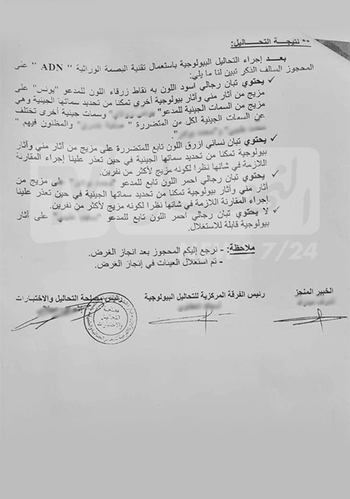 وأظهر تقرير الخبرة والتقرير الجنائي، التي تحوز “النهار” على نسخة منه. بأن الفتاة لا تحمل أي علامات تدل على تعرضها للاغتصاب ولم يثبت وجود أي شيء على جسمها أو ثيابها يعود للمتهمين.
