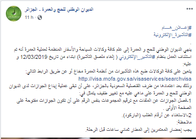 أخطر الديوان الوطني للحج والعمرة كافة وكالات السياحة والأسفار المنظمة لعملية العمرة أنه تم استئناف العمل بنظام التأشير الإلكتروني.