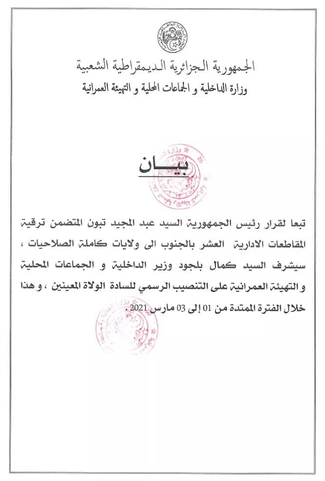 وكان رئيس الجمهورية، عبد المجيد تبون قد قرر في خطابه الأخير، ترقية المقاطعات الإدارية العشر بالجنوب إلى ولايات كاملة الصلاحيات.