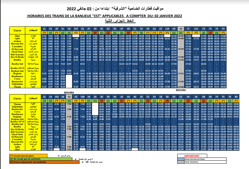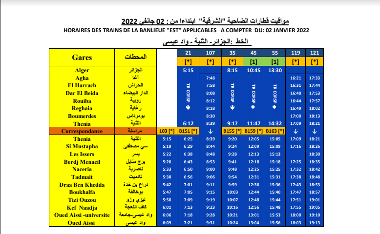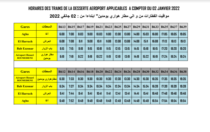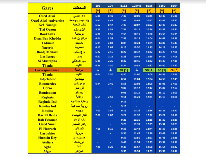 *الجزائر العاصمة – تقرت: الإنطلاق على الساعة السادسة وعشر دقائق مساء، الوصول على الساعة الخامسة صباحا.