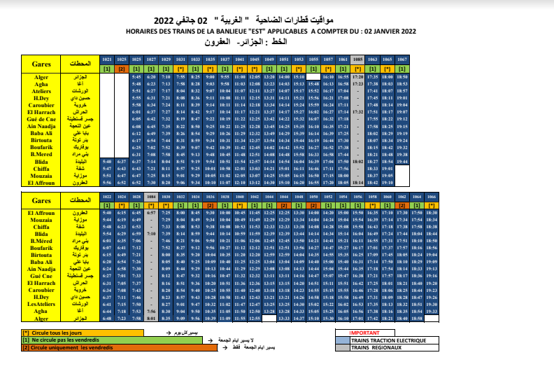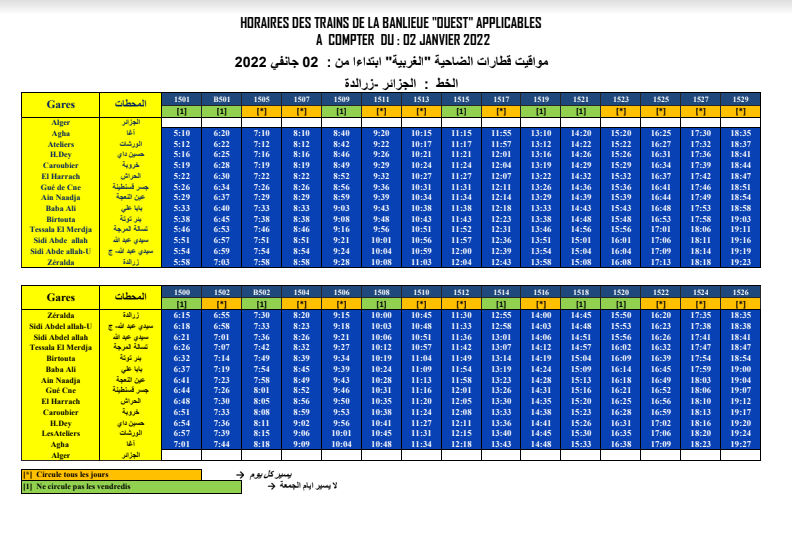 للإشارة أعلنت الشركة الوطنية للنقل بالسّكك الحديدية، خلال الأيام الماضية عن استئناف حركة سير قطارات الضاحية. وهذا على خطوط الجزائر العاصمة باتجاه العفرون - الثنية – زرالدة (ذهابا وإيابا) حسب البرنامج اليومي لها.