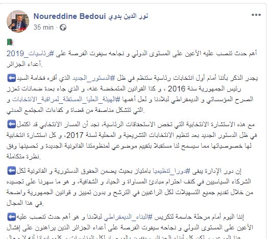 ونشر بدوي على صفحته الرسمية في تويتر: يجدر الذكر بأننا أمام أول انتخابات رئاسية ستنظم في ظل الدستور الجديد الذي أقره رئيس الجمهورية سنة 2016.