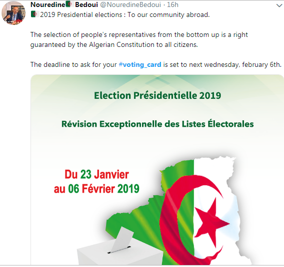 ونشر نور الدين بدوي في صفحته الرسمية “تويتر”: أن الموعد الأخير لطلب بطاقة الانتخاب بالنسبة للمغتربين هو يوم 6 فيفري” .