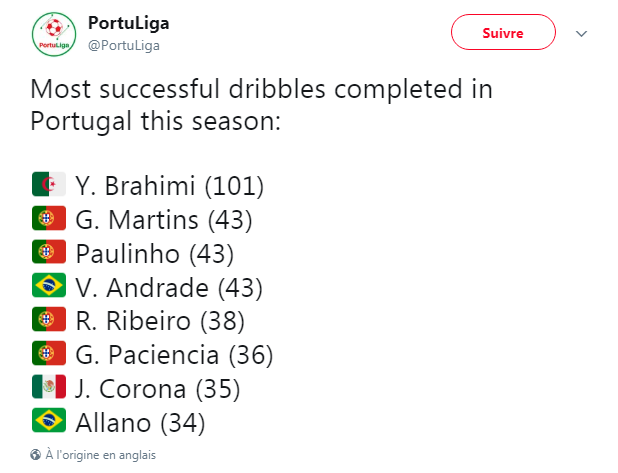 كشفت الصحافة البرتغالية، أنّ الجزائري “ياسين براهيمي” نجم نادي بورتو هو أفضل مراوغ في السوبر ليغا لهذا الموسم وبفارق كبير عن أقرب منافسيه.