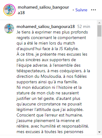 ونشر بانغورا اعتذاره عبر “ستوري” على صفحته الرسمية على إنستغرام بعد ساعات من معاقبته، قائلاً: “اقدم اعتذاري الشديد بخصوص التصرف الذي بدر مني خلال مباراة اليوم أمام شبيبة القبائل”.