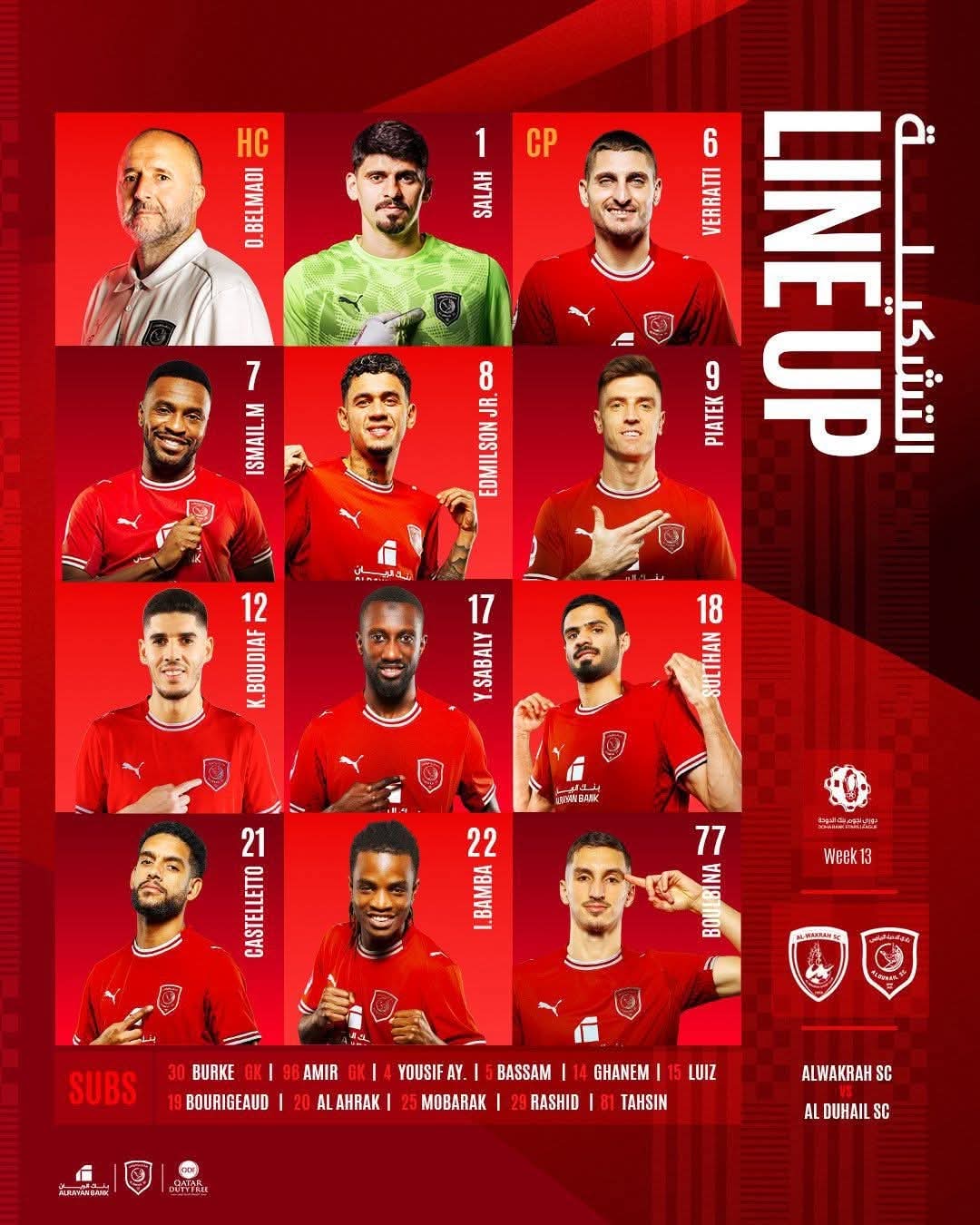 كما تواجد المهاجم الجزائري الآخر، عادل بولبينة، أساسيا هو الآخر، ضمن التشكيلة الأساسية التي كشف عنها نادي الدحيل.