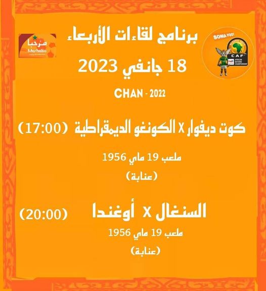 و سيواجه منتخب الكونغو الديمقراطية نظيره منتخب كوت ديفوار بملعب 19 ماي بعنابة بداية من 17:00 سا بالتوقيت المحلي في لقاء لا يقبل القسمة على اثنين.