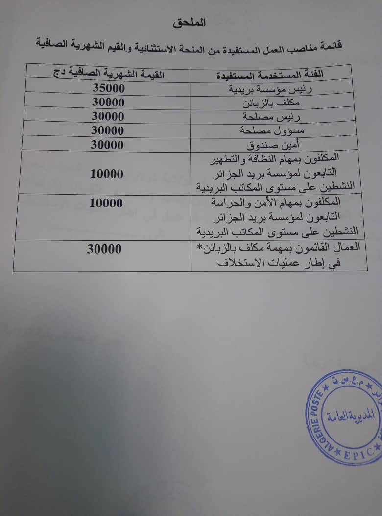 كما حدد بيان المؤسسة أن المنحة الإستثنائية تصرف شهريا بناءً على القوائم الإسمية للفئة المستخدمة طبقا للمادة 2 المبلغة دوريا من قبل مدراء وحدات الولائية للبريد.