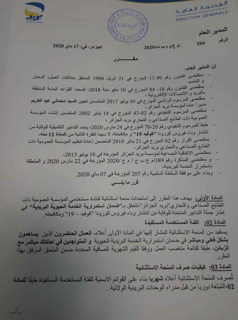 إستحدثت مؤسسة بريد الجزائر منحة إستثنائية لفائدة مستخدمي المؤسسة العمومية لضمان خدمة الإستمرارية الحيوية البريدية، في إطار التدابير المتخدة للحد من إنتشار فيروس كورونا كوفيد 19.