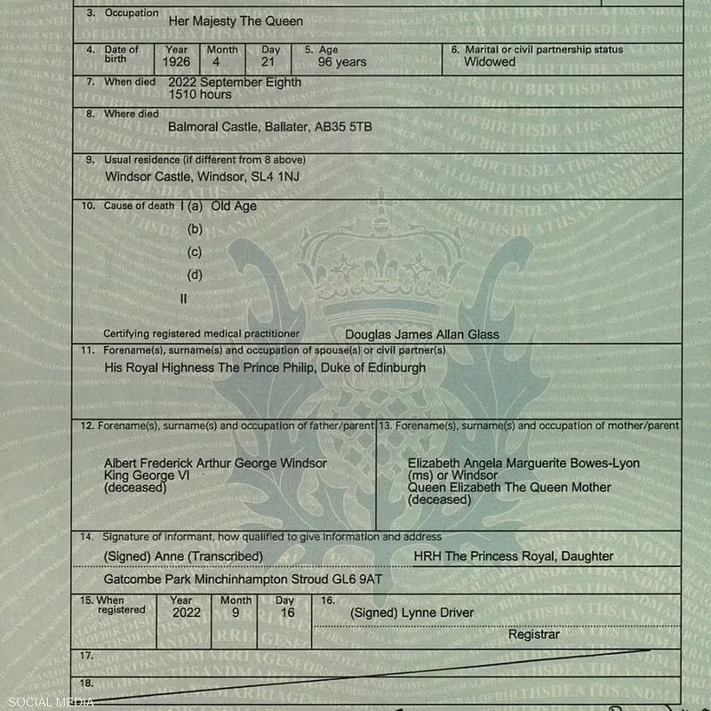 وبعد مرور 10 أيام على جنازتها الرسمية، نشر الموقع الرسمي لـ”المحفوظات الوطنية في اسكتلندا”، اليوم، شهادة وفاة الملكة إليزابيث.