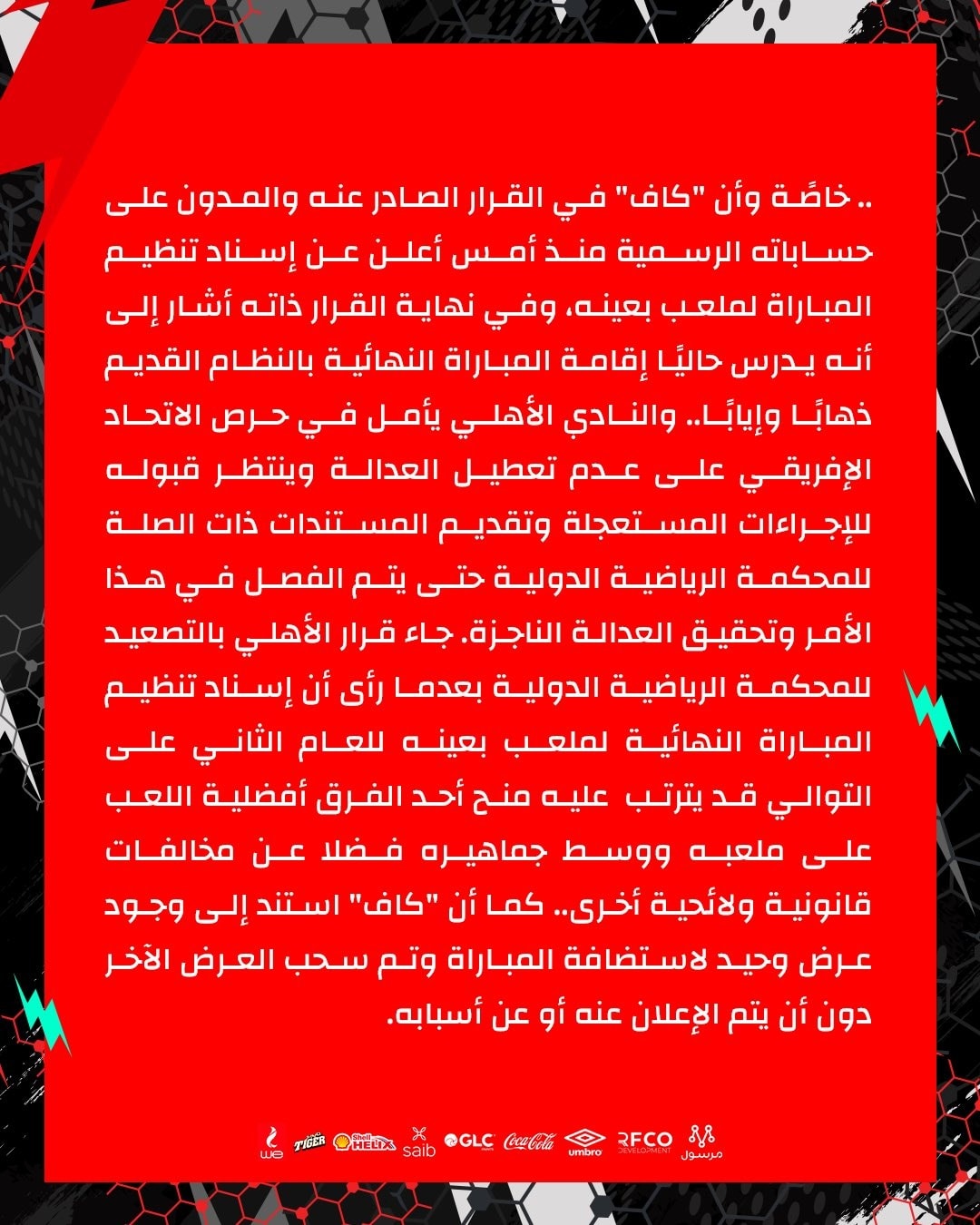 كما أضاف البيان:”فضلًا عن أمور أخرى تخل بالميثاق الأولمبي ولوائح الفيفا ولوائح الاتحاد الإفريقي ذاته،