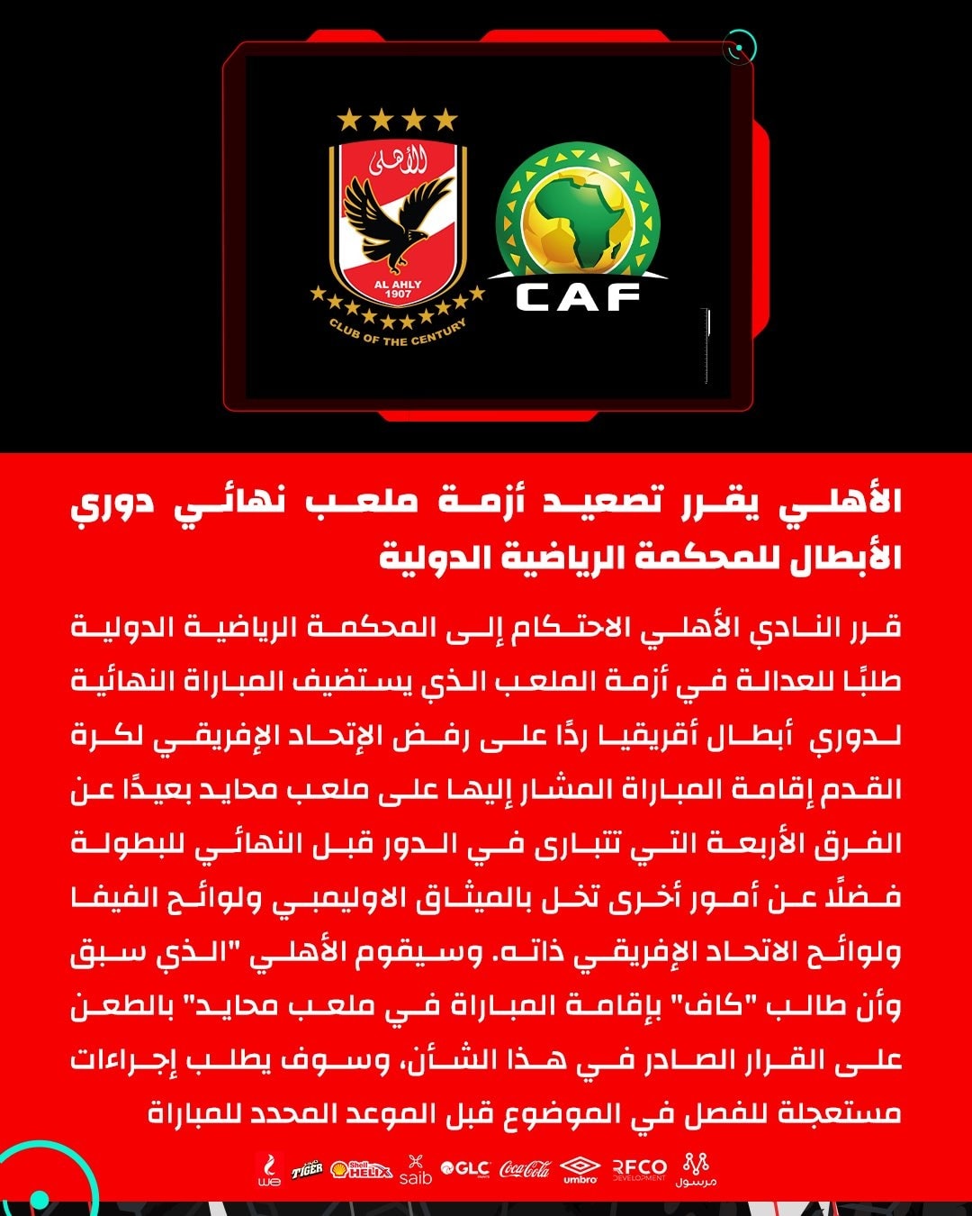 قرر الأهلي المصري، اللجوء للمحكمة الرياضية الدولية، اعتراضا على قرار الإتحاد الإفريقي “الكاف”، المتمثل في إقامة نهائي رابطة الأبطال بالمغرب.